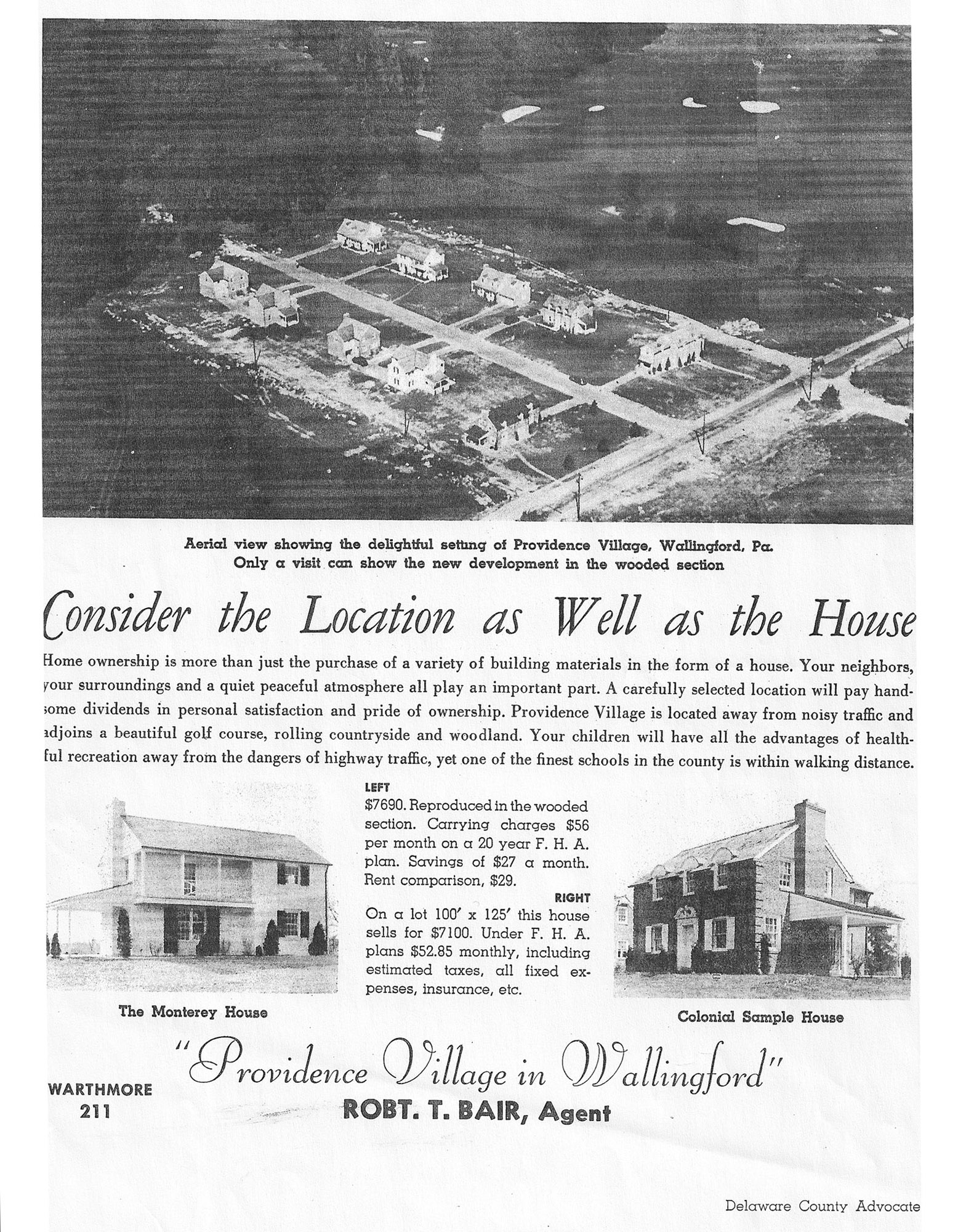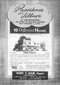 In 1939, on 50 acres of the former farm, at Rose Valley Road and East Country Club Lane, Roach and Roach Builders began construction on Providence Village. The parcel was divided into 38 homesites of approximately 1/4 acre each. The developer seemed to be of two minds when marketing the location; in some ads calling the neighborhood “Providence Village of Swarthmore” and others calling it “Providence Village in Wallingford.” In every ad, the bucolic setting was described – “The location…with its adjoining golf course and century old wooded section will appeal to you and your family and will maintain its present desirability for all time.” The adjoining course was the public Mary Lyons Golf Course which had not yet been developed. Private Springhaven Club (at that time offering swimming, tennis and golf) was just to the south. The wooded section was described as “ten acres of virgin hardwood forest” within which were to be constructed the builder’s “finer homes.” With nothing but wide open space between, the College’s Clothier Tower was “a majestic view across our windswept fields.” That majestic view was to last about ten years, when the next development began construction.