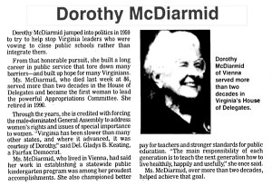 (8) Dorothy Shoemaker (Swarthmore ’29) was a Political Science major. She had a career in the family business, McDiarmid Realty, before entering politics in 1959. She served as a Democrat in the Virginia House of Delegates, 35th District, in 1960-1961, 1964-1969, and 1972-1989. She also served on the Swarthmore College Board of Managers.